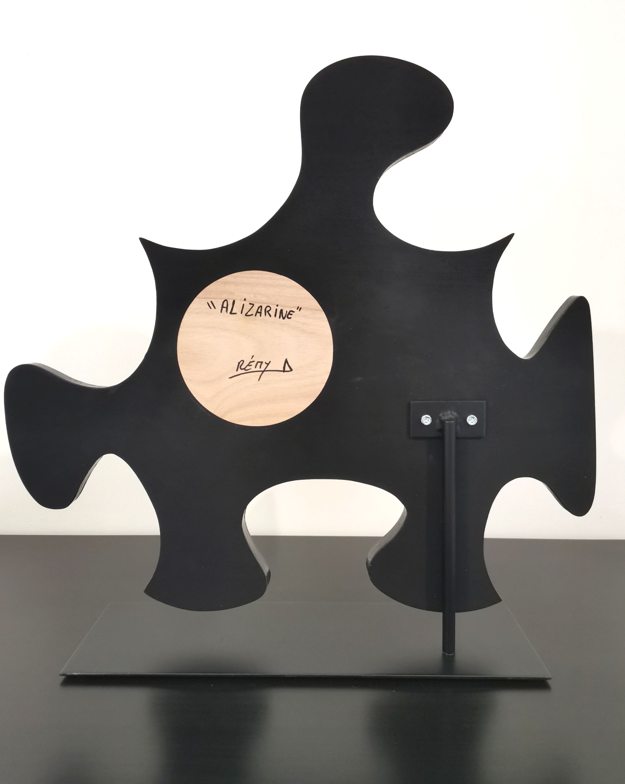 L’œuvre est fixé sur un socle en métal. petits caoutchoucs sous le socle pour ne pas rayer l’endroit où l’on souhaite la poser.