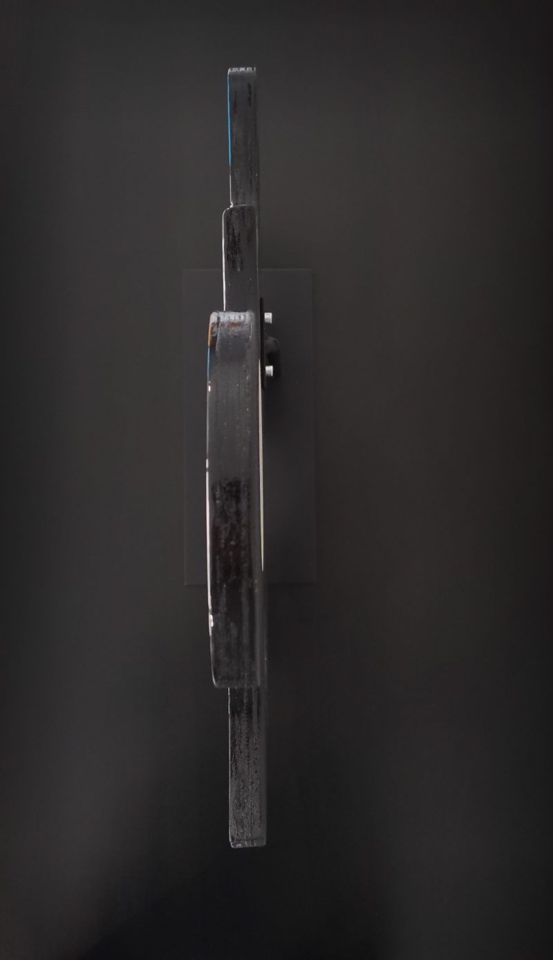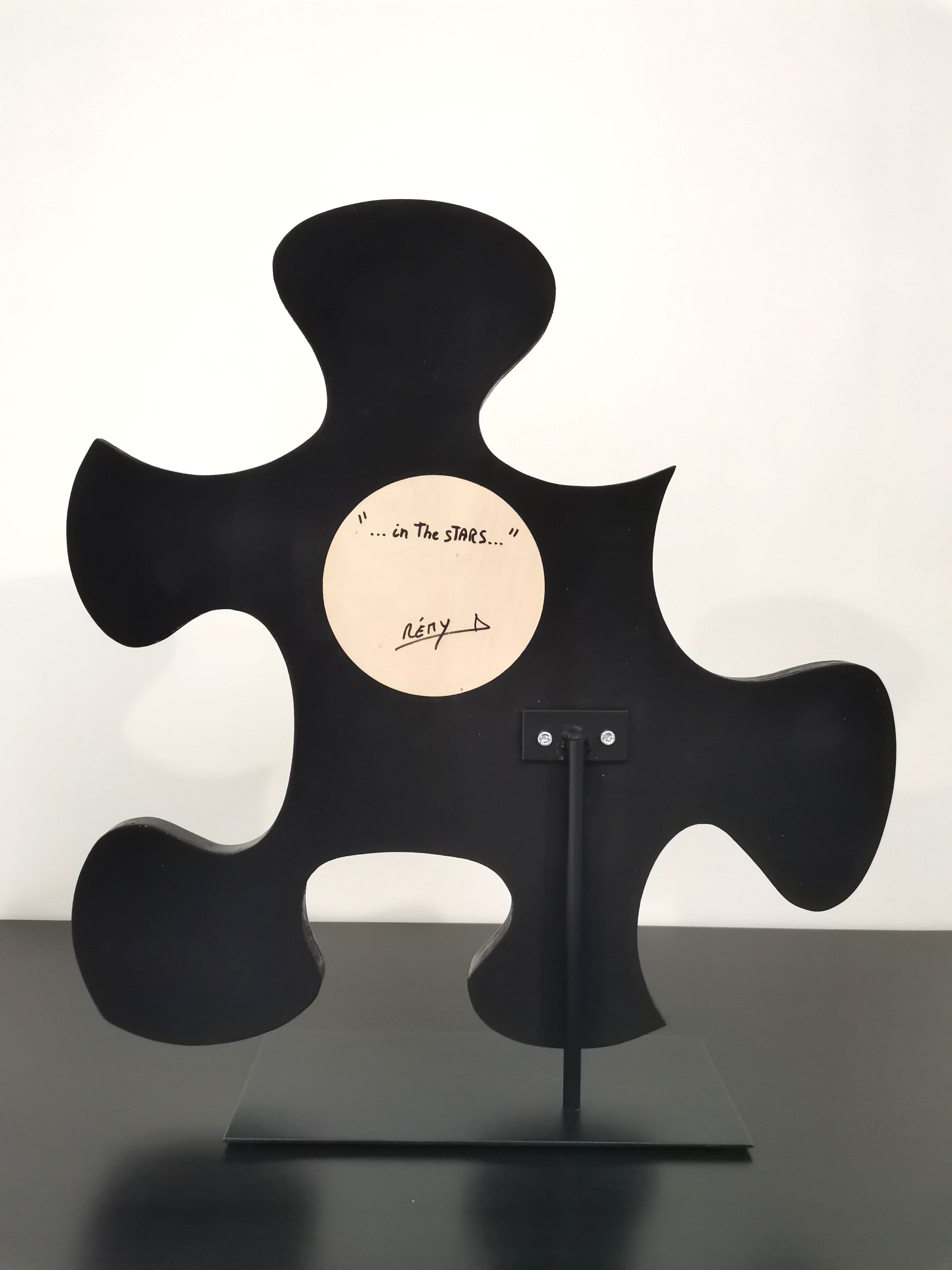 L’œuvre est fixé sur un socle en métal. petits caoutchoucs sous le socle pour ne pas rayer l’endroit où l’on souhaite la poser.