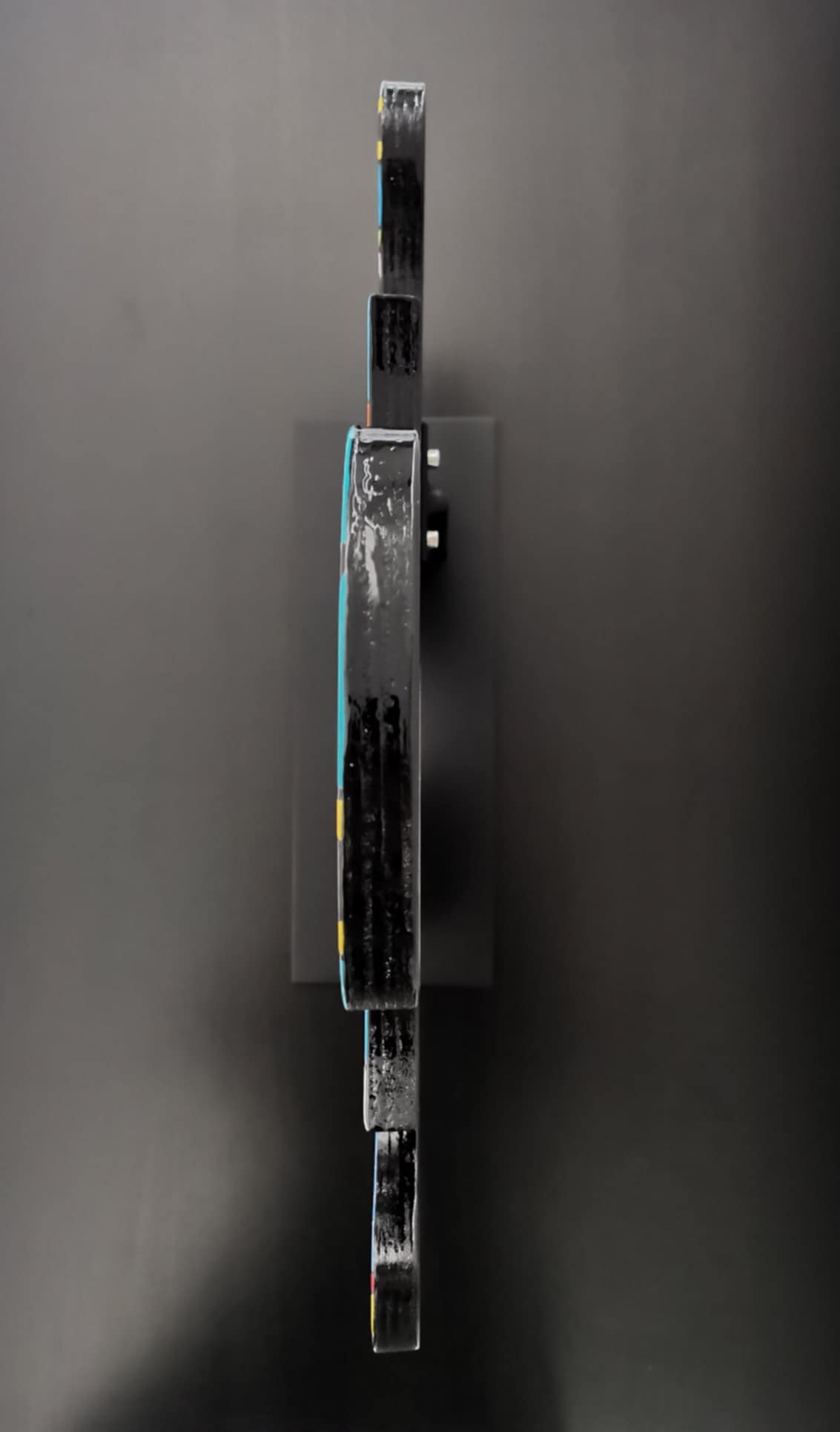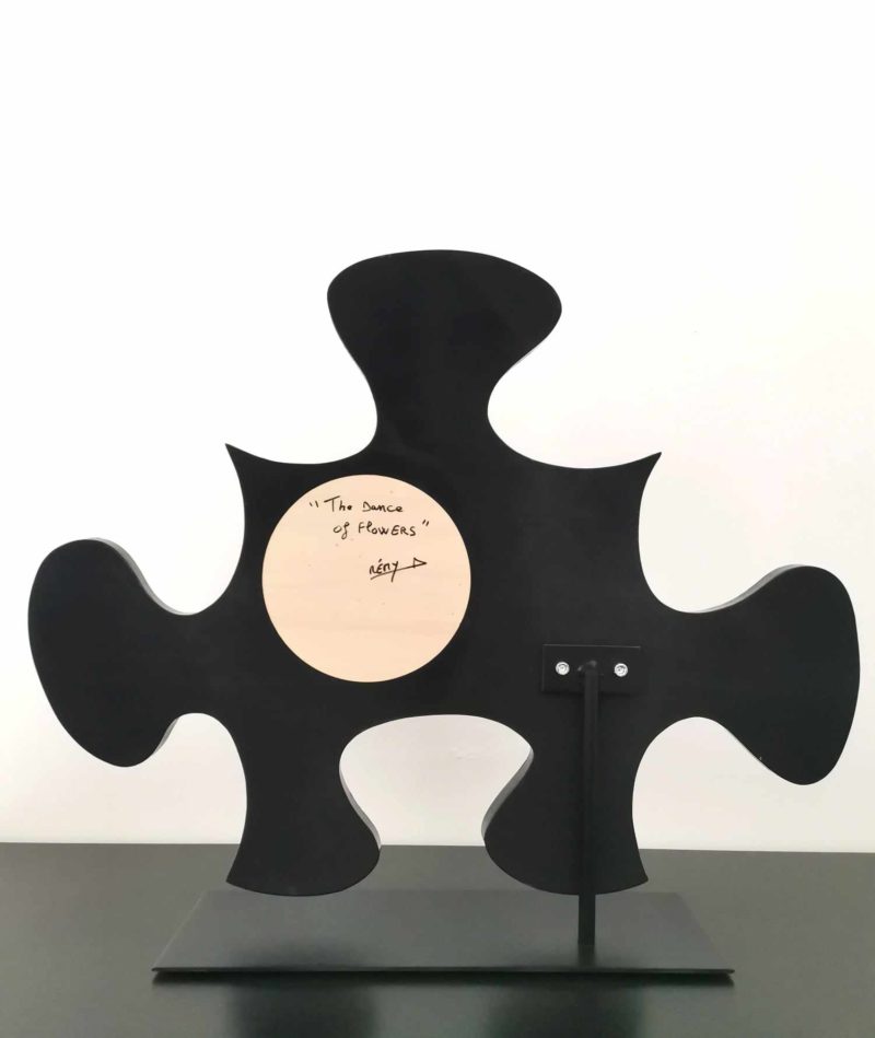 L’œuvre est fixé sur un socle en métal. petits caoutchoucs sous le socle pour ne pas rayer l’endroit où l’on souhaite la poser.